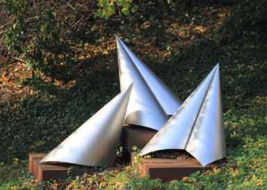 geb. 1927 in Remtengrün im Vogtland, Sachsen Die 2007 an Adlers 80. Geburtstag eingeweihte Arbeit ohne Namen, wurde von ihm - ausgehend von dem Papiermodell - extra für den derzeitigen Standort geschaffen. Ein Stahlbauer aus der Sächsischen Schweiz hat mit 13 Leuten die Faltung des Aluminiums von Hand ausführen lassen. Die Arbeit ist streng formal aufgebaut: die Quadrate der Podeste stehen in einem speziellen Verhältnis zu den als „Tüten“ geformten Aluminiumplatten.Adler hat ein sehr vielfältiges Werk geschaffen: er begann zunächst eine Lehr- und Forschungstätigkeit auf dem Gebiet der Architektur und Bauplastik und hat zu DDR-Zeiten verschiedene Betonformsteinsysteme entwickelt.Später war er als freischaffender Künstler tätig und setzte sich schon früh mit der konkreten Kunst auseinander. Arbeiten, die er ohne Kenntnis der westlichen Arbeiten auf diesem Gebiet, geschaffen hat, haben heute unvermindert Gültigkeit. Von 1988-1995 hatte er eine Gastprofessur an der Kunstakademie Düsseldorf.